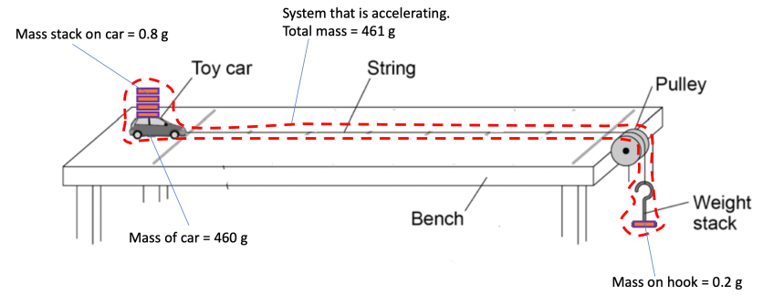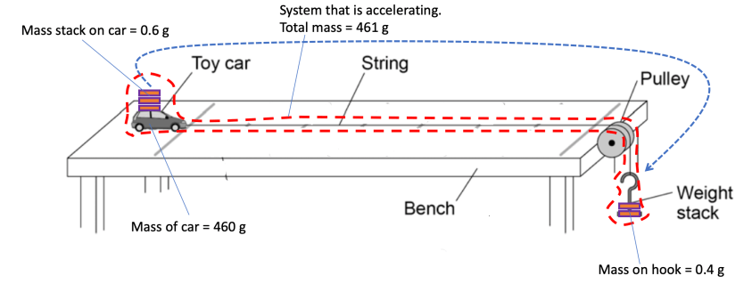 The parts of our system that are accelerating are the toy car, the string and the weight stack. The total mass of the accelerating system shown below is 461 g (assuming the mass of the hook and the string are negligible).