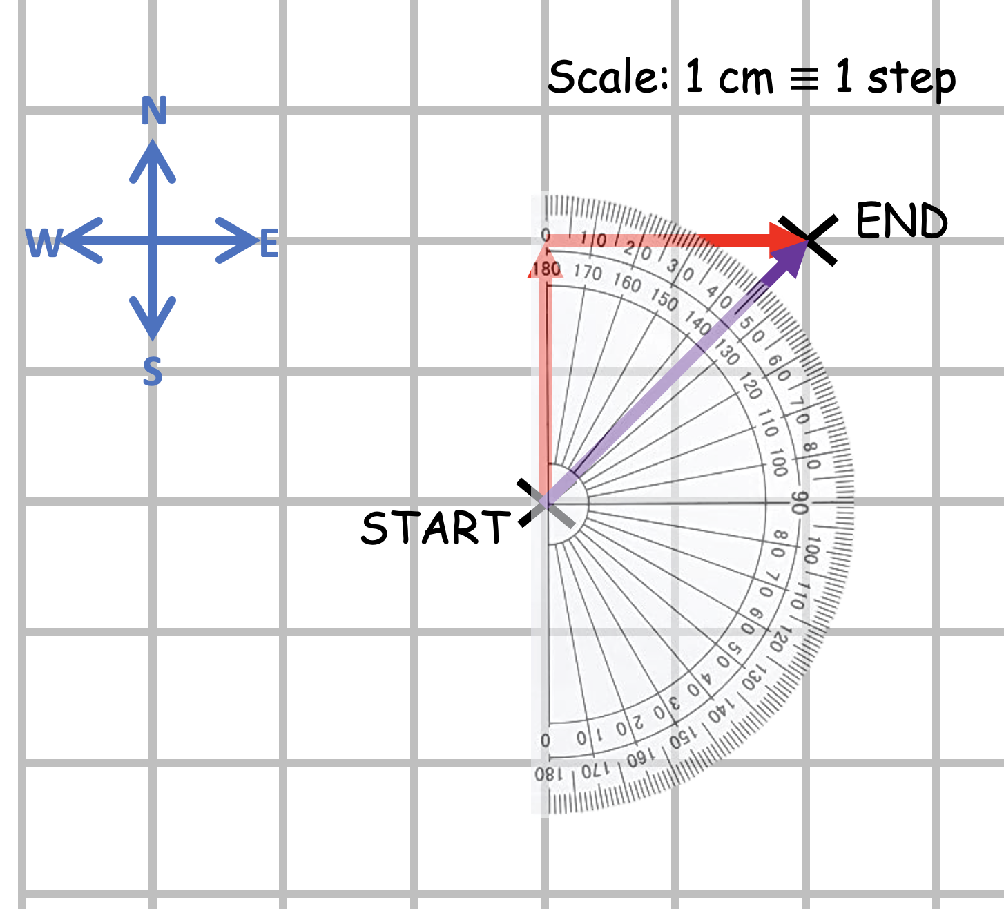 How would we go about finding the resultant vector if we moved 3 metres north and 4 metres east? If you have access to an interactive whiteboard, you could choose to use this Jamboard for this phase. (One minor inconvenience: you would have to draw the straight lines freehand but you can use the moveable and rotatable ruler and protractor to make measurements ‘live’ with your class.)