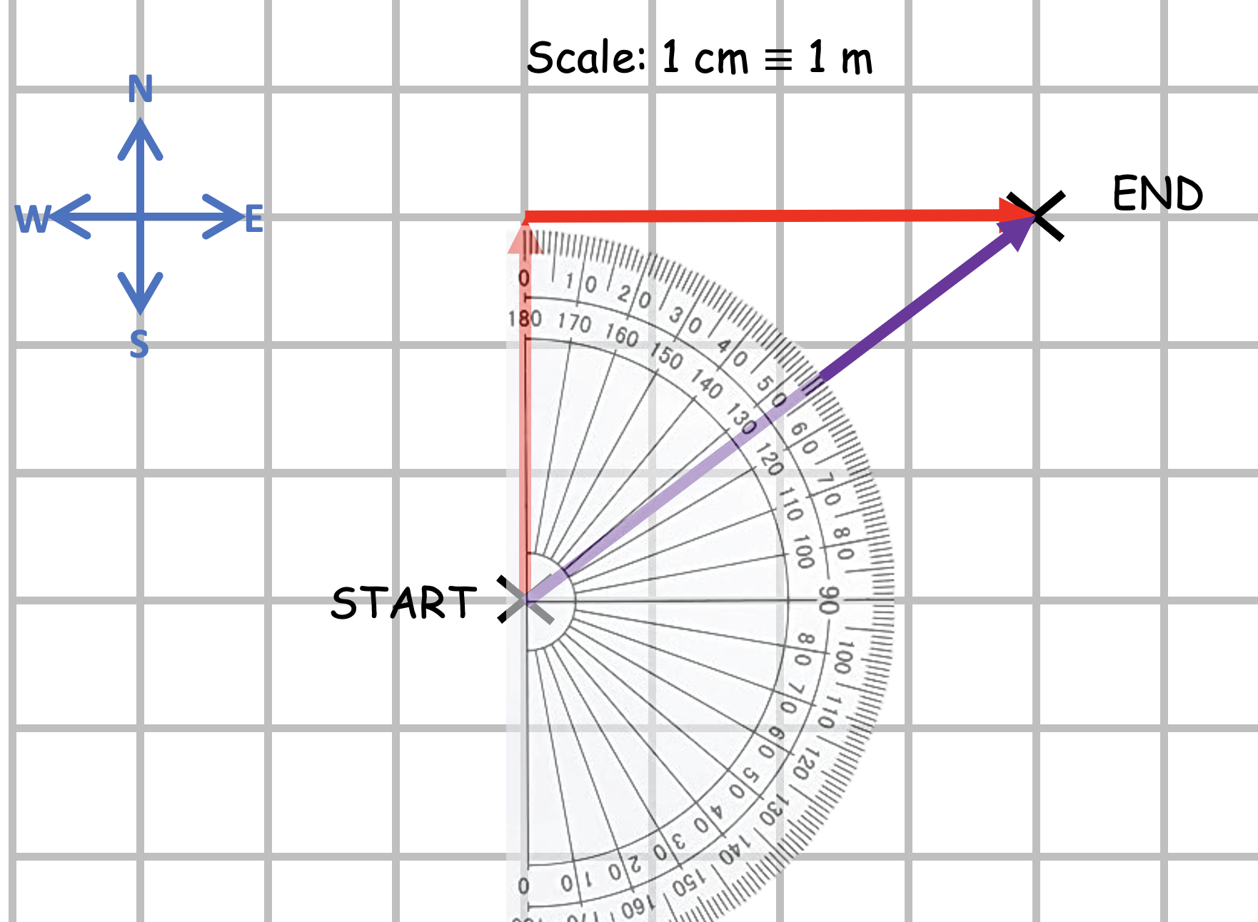 Students may guess that the direction of the purple ‘resultant’ vector (that is to say, it is the result of adding two vectors) is precisely north-east, but this can be a vague description so let’s use a protractor so that we can find the compass bearing.