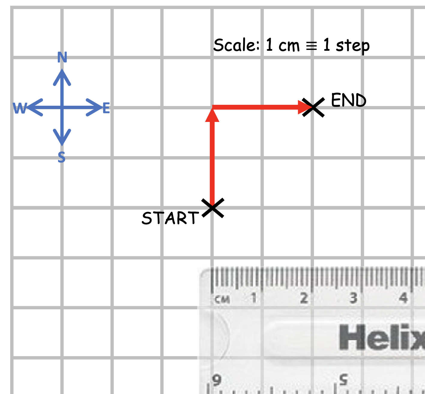 The length of the line is 2.8 cm which means that if we walk 2 steps north and 2 steps east then we up a total vector distance of 2.8 steps away from the Start.