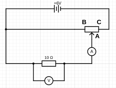 When the slider is at B, the voltmeter will read 0.0 V and the current through the 10 ohm resistor will be 0.0 amps. A small movement of the slider from B towards C will increase the reading of the voltmeter to (say) 1.0 V and the ammeter would read 0.1 A. Further small movements of the slider will gradually increase the potential difference across the resistor until it reaches the full 6.0 V when the slider is at C.