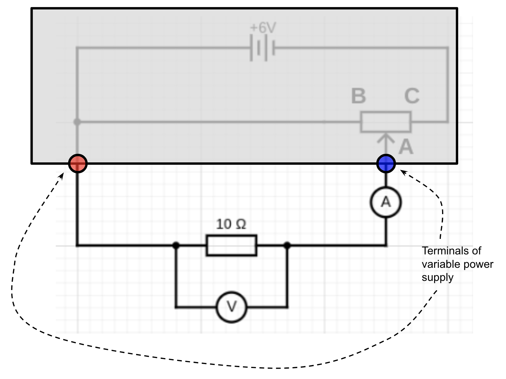 This circuit is a far better one for obtaining the data for a current-potential difference graph. This is because we can access the full 0.0 V to 6.0 V of the supply simply by adjusting the position of the rheostat slider. The rheostat is being used as a potential divider in this circuit rather than as a simple variable resistor.