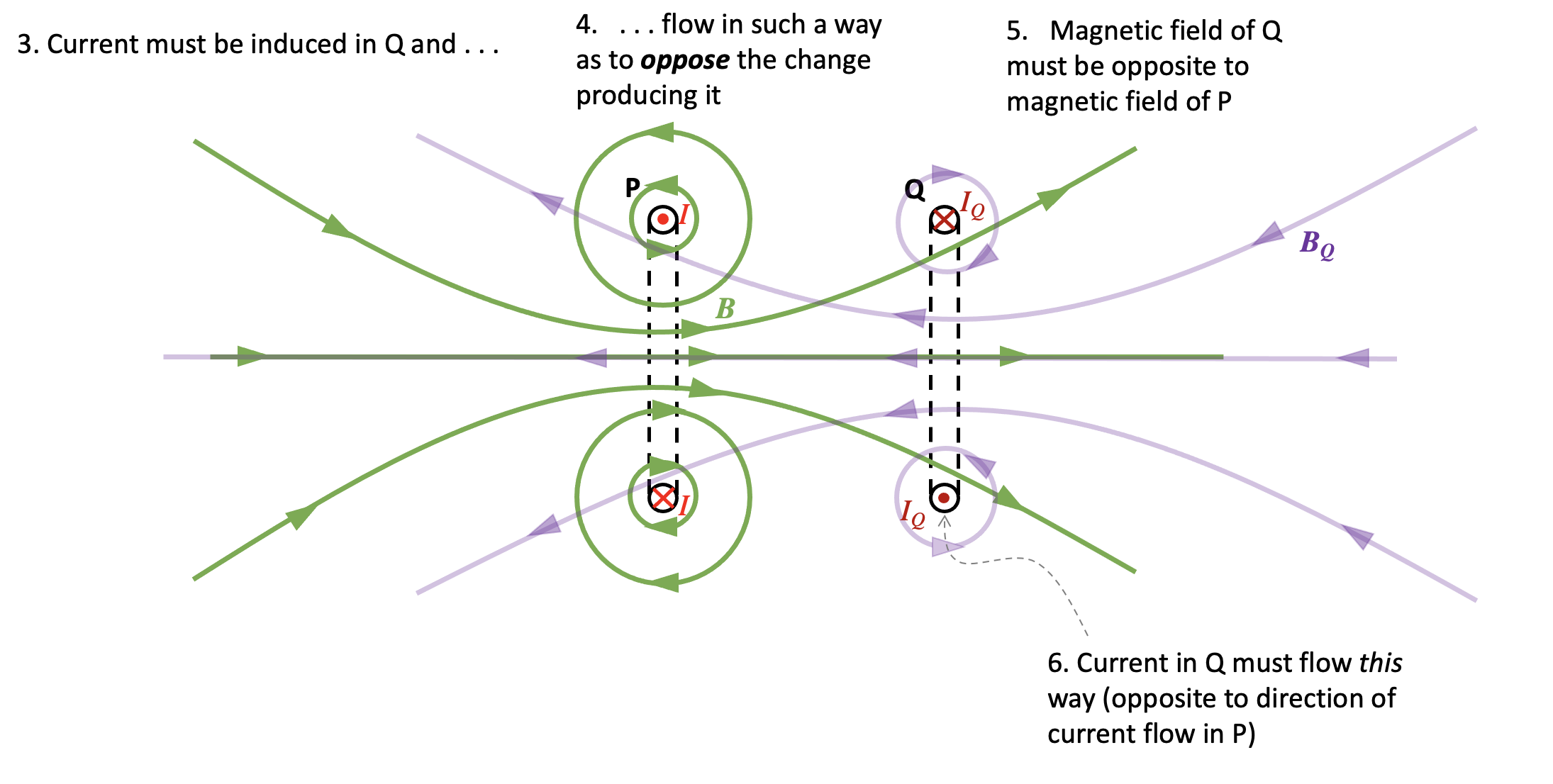 The current in coil Q must flow in such a direction so that it opposes the change producing it.