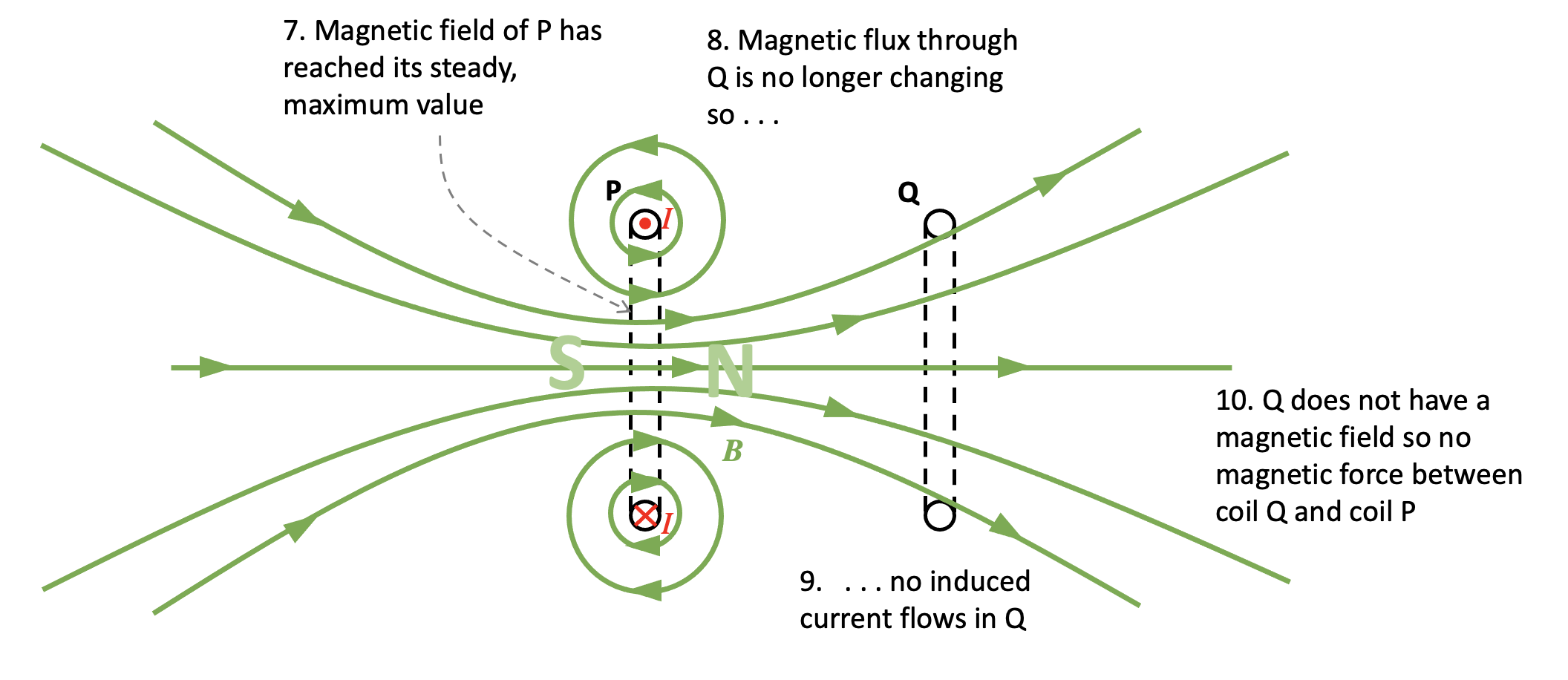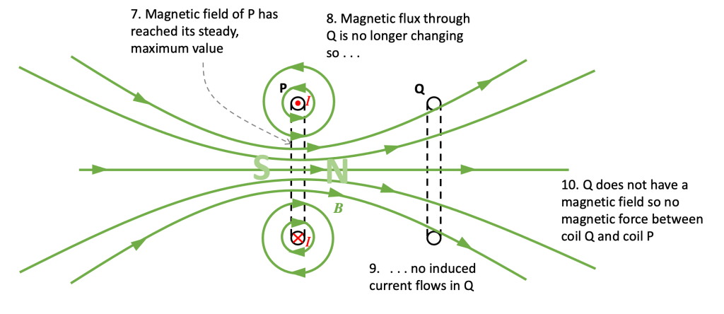 Because the magnetic field produced by coil P has how reached its steady maximum value, this means that the magnetic flux through coil Q also has a constant, unchanging value. Since there is no change in magnetic flux, then this means that no emf is induced across the coil so no induced current flows. Since Q does not have a magnetic field it follows that there is no magnetic interaction between them.