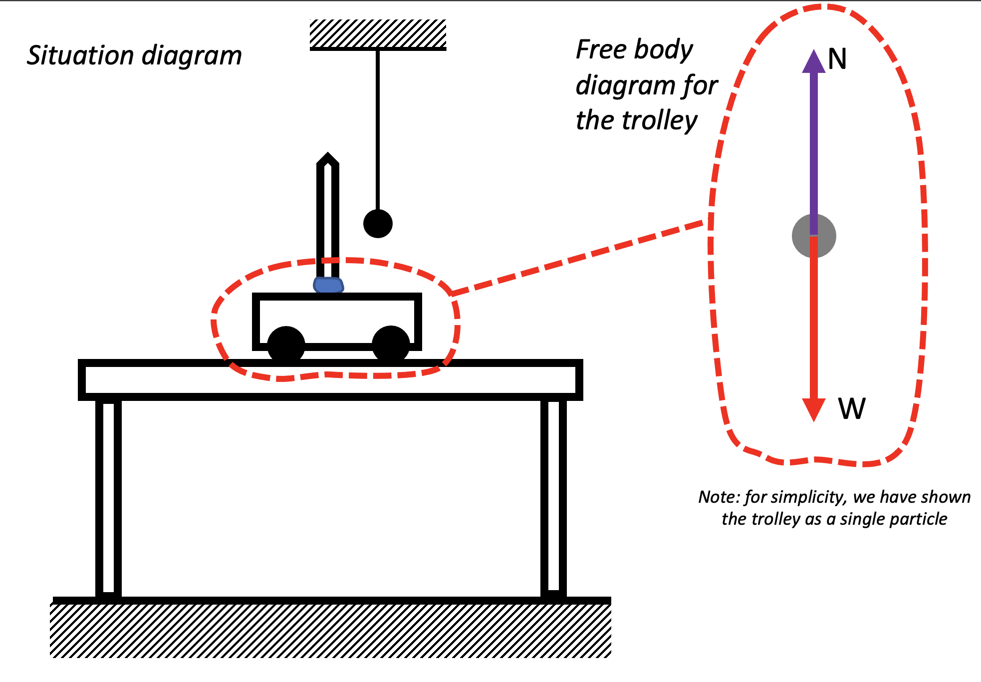 The normal reaction force N on the trolley is equal and opposite to the weight W of the trolley. The resultant (total) force on the trolley is zero so it is not accelerating.