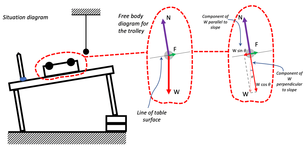If the wheels of the trolley were in contact with the table surface so that the frictional force were negligible, then the trolley would accelerate down the slope because of the resultant force of W sin 𝜃 parallel to the slope. The direction of the acceleration is parallel to the slope (i.e. at 90o to the local perpendicular) and not along the absolute horizontal as suggested by the earlier, simpler GCSE-level analysis in the previous section.
