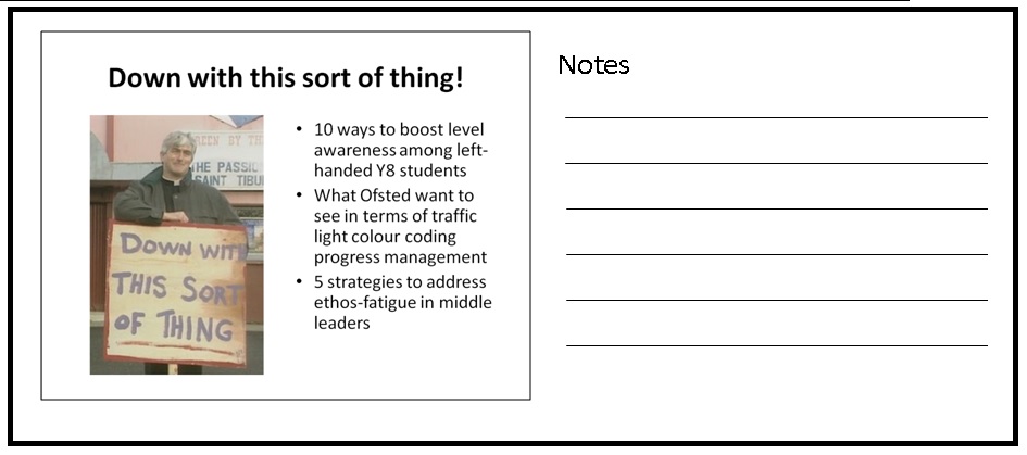 “I AM NOT A NUMBER, I AM EXPERIENCED AND SKILLED INDIVIDUAL WHO DESERVES DUE MEASURE OF PROFESSIONAL AUTONOMY!!!” [Cue maniacal laughter from SLTs and the DfE as lightning flashes and thunder roars.]