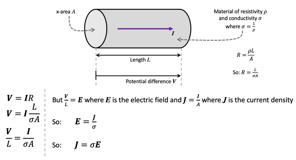 We can see that if we consider an ohmic conductor then for a current flow of uniform current density J we need a uniform electric field E acting in the same direction as J.