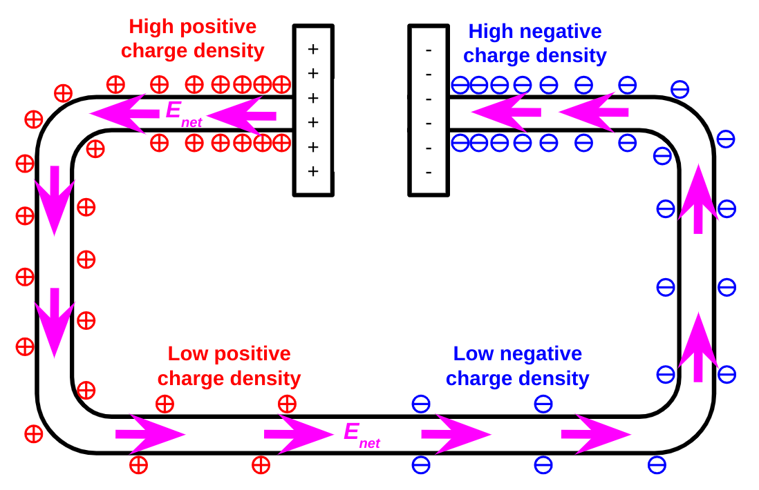 In essence, the electric field of the battery polarises the conducting material of the circuit producing a non-uniform arrangement of surface charges. The pattern of surface charges produces an electric field of constant magnitude Enet which drives a current density of constant magnitude J through the circuit.